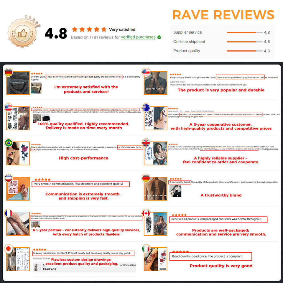 Design:Oltre 10.000 diversi design di tatuaggi disponibili in magazzino per la vendita.