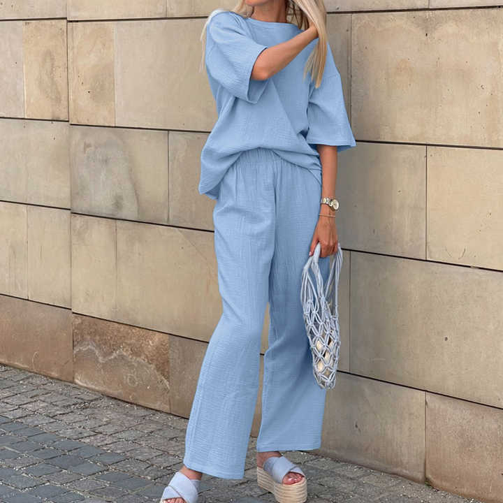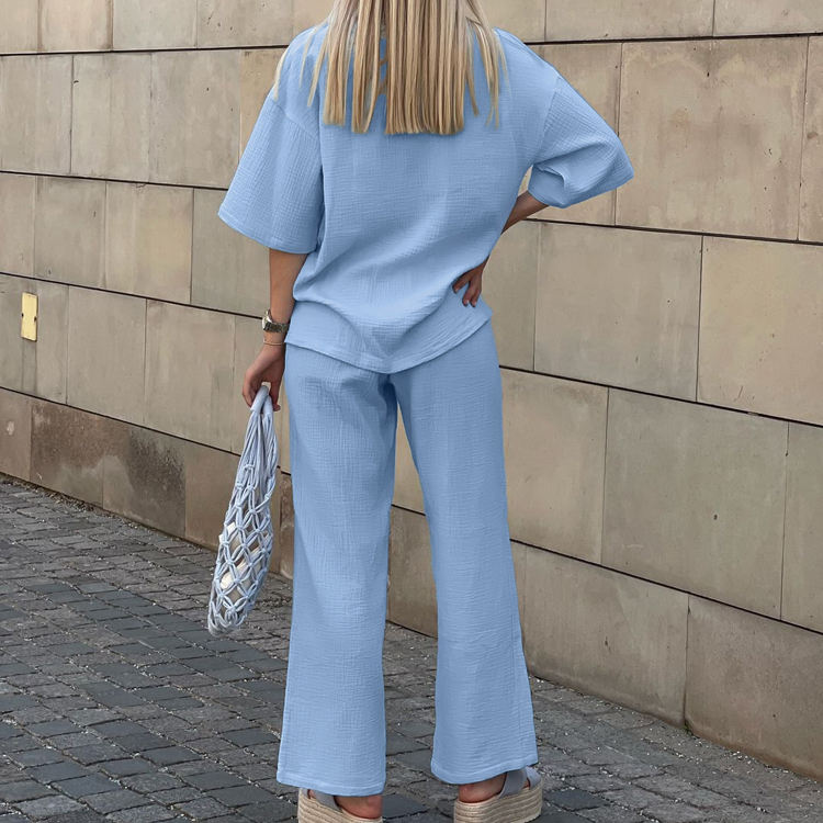 Wholesale Light Blue Drop Shoulder Tshirt Top And Pants Cotton 2026 Summer Female Clothing Women Casual Two Piece Set