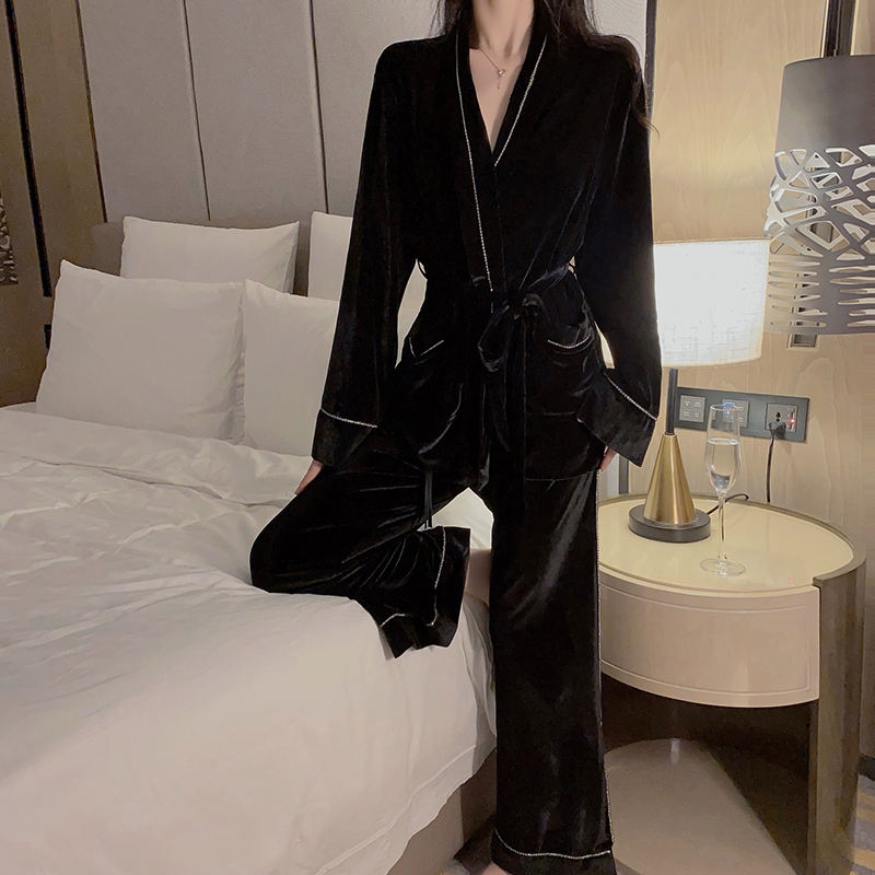 Wholesale Lounge Wear Luxury Sleepwear Women's Black Velvet Diamond Chain Kimono Shirt and Pants Sweet Winter Pajamas Set Q2859