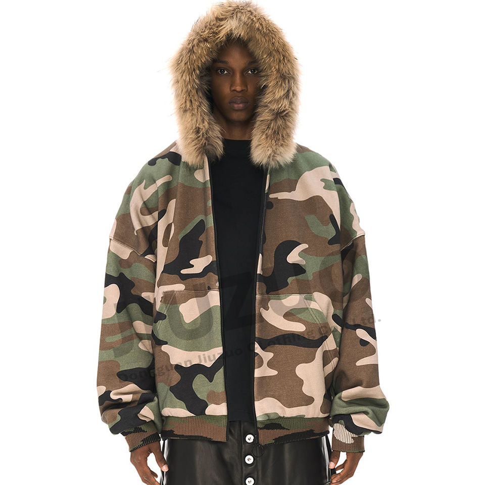 Wholesale Luxury Camouflage Print Fur Hoodie Men Zip up Oversized French Terry Hooded Jackets Thermal Sweatshirts with Fur Homme