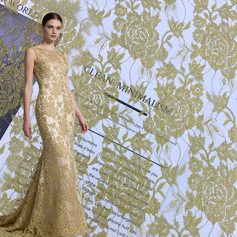 Tessuto Floreale di Lusso con Filo Dorato Lucido per Abiti da Sposa, Abiti da Sera e Abiti da Cerimonia