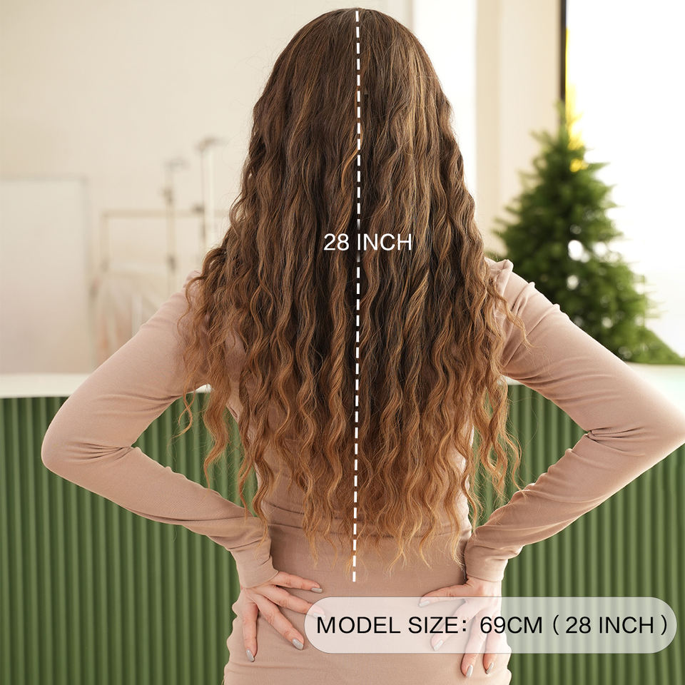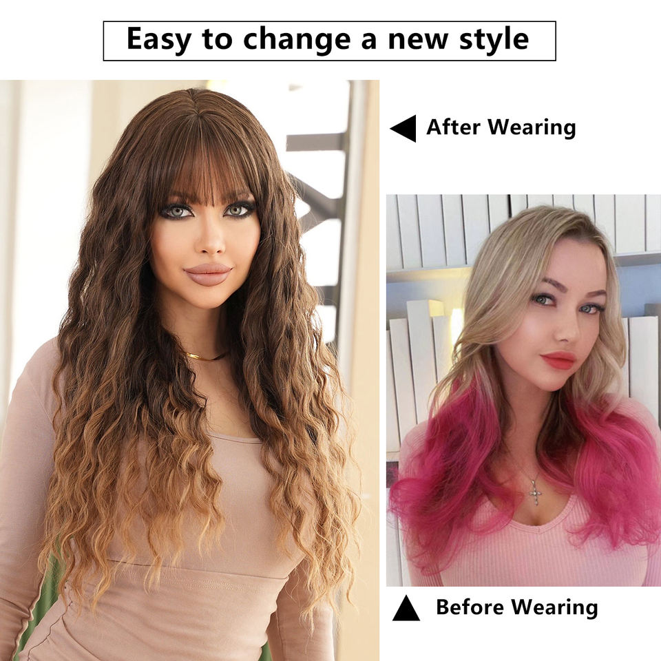 Parrucca a Macchina con Frangia Lunga Ondulata Ombre Marrone Chiaro Parrucca Naturale Riccia Sintetica per Donne Peluca Sintetica per Uso Quotidiano