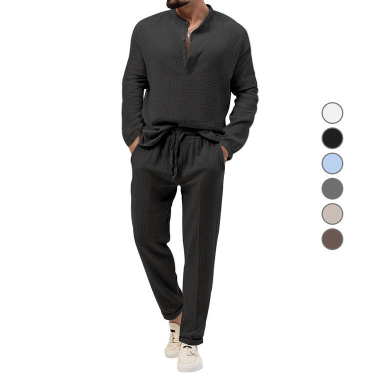 Wholesale Men's 2 Piece Set Casual Cotton Linen Long Sleeve Men's Sets Custom Linen Shirt and Pants Sets for Men