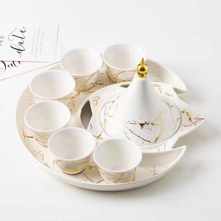 Set da tè da caffè in ceramica Eid Ramadan musulmano all'ingrosso Set di tazze da tè Creative di nuovo stile con vassoio Set di tazze Cawa dorate da 8 pezzi per la casa