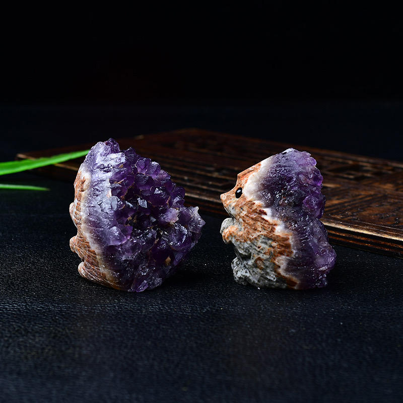 All'ingrosso gemme naturali pietra curativa figurina animale ametista grappolo inciso riccio per la decorazione