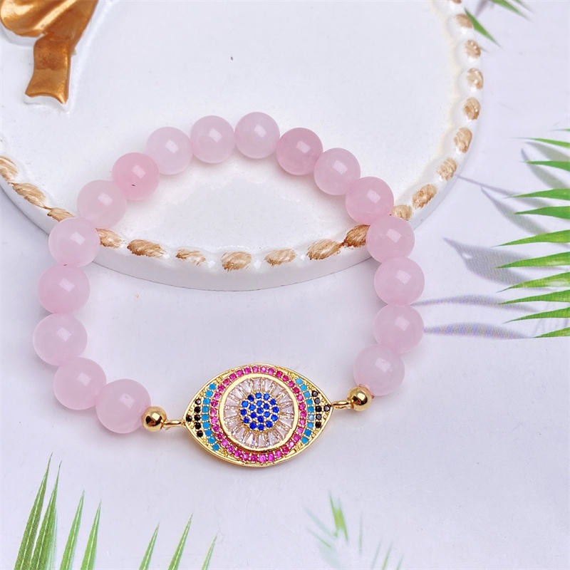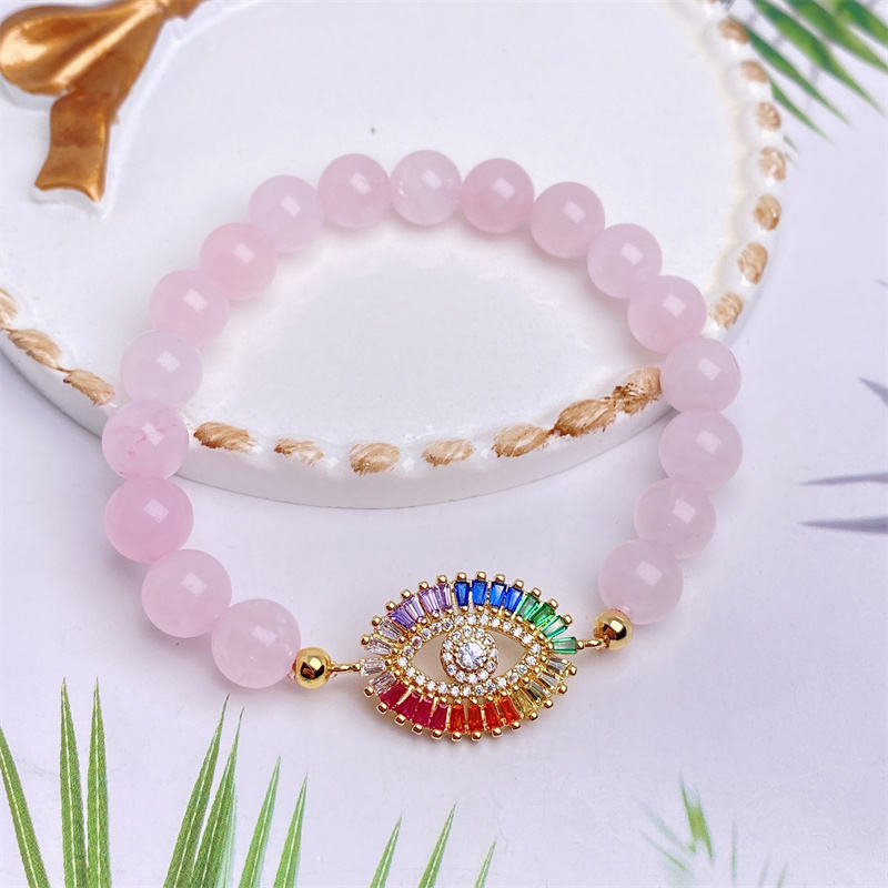 Braccialetto con Perle di Quarzo Rosa Naturale e Charm Protezione Contro il Malocchio, Gioiello Curativo in Cristallo, Regalo per Donne