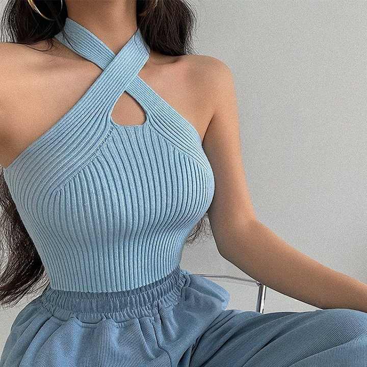 Wholesale New Fashion Hot Girls Halter Knit Tops Female Shoulder Crop Tops Cross Strappy Sexy Women Tank Tops