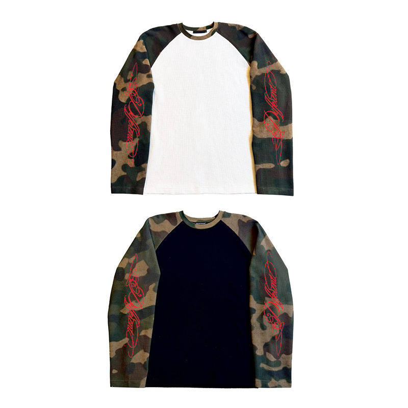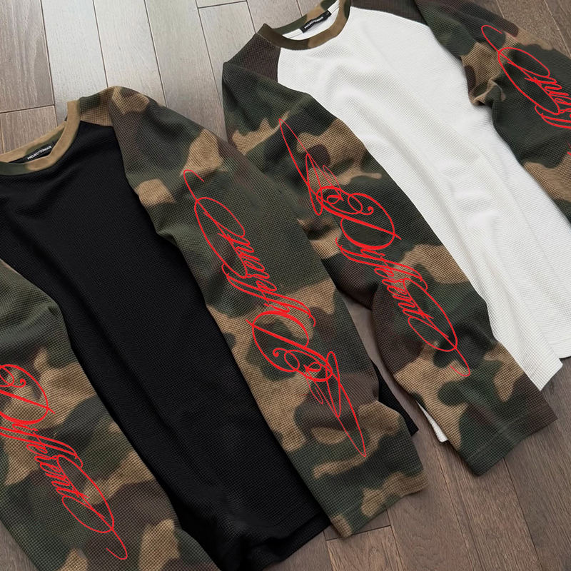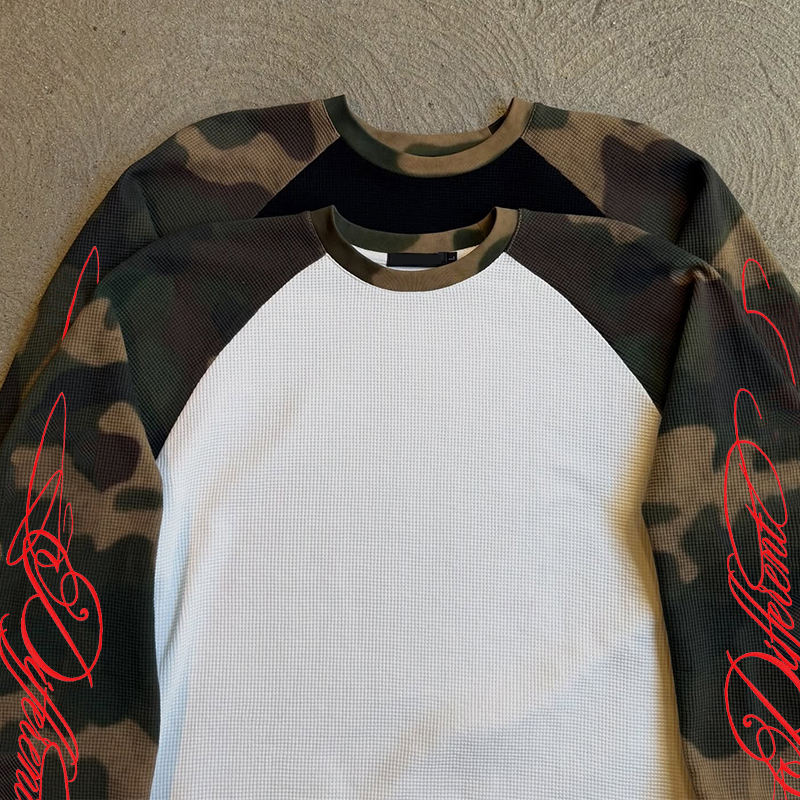 T-Shirt a Maniche Lunghe con Motivo Mimetico in Maglia Waffle, Ricamata, Produzione OEM all'Ingrosso