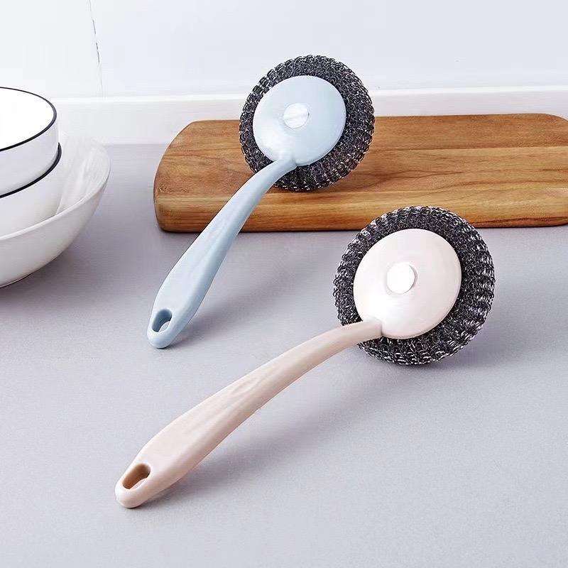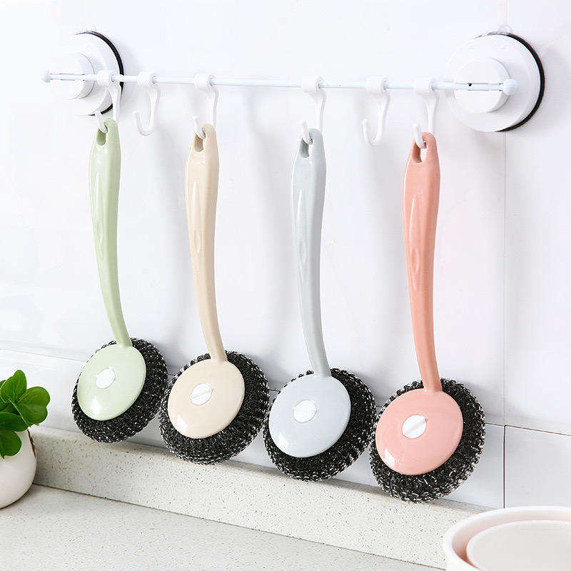 Wholesale PET Long Handle Pot Pan Dish Washing Scrub Brush Kitchen Eco-Friendly Tool With Stainless Steel Wire Ball for Cleaning