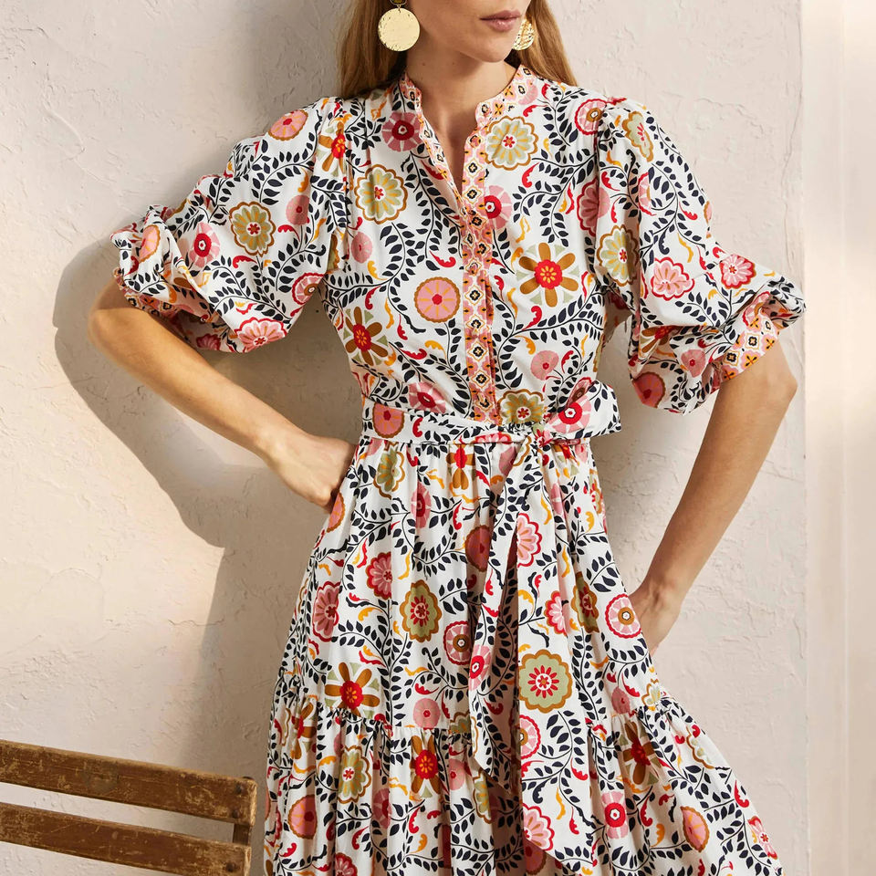 Wholesale Puff Sleeve Long Maxi Summer Clothes Printed Cotton Rayon Fabric Custom High Quality Women's Boho Dresses