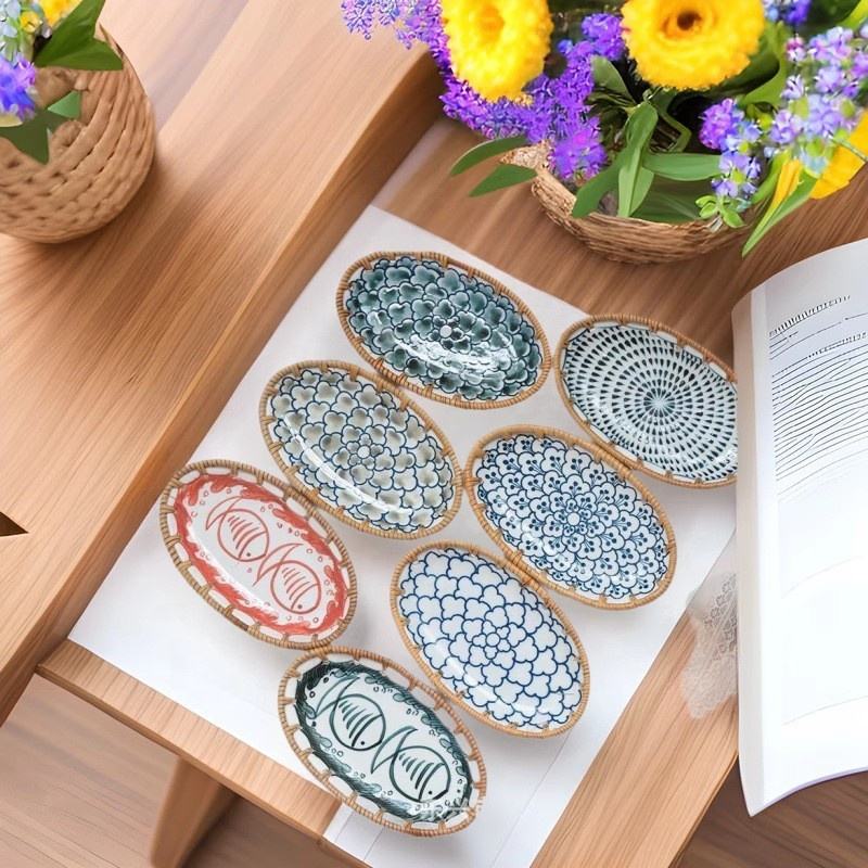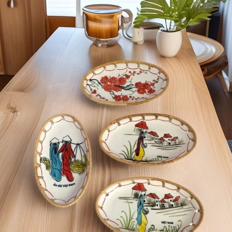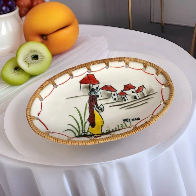 Wholesale Rattan Ceramic Fruit Plate Vietnamese Creative Dessert Plate Snack Table Storage Plate Household Dim Sum Dish