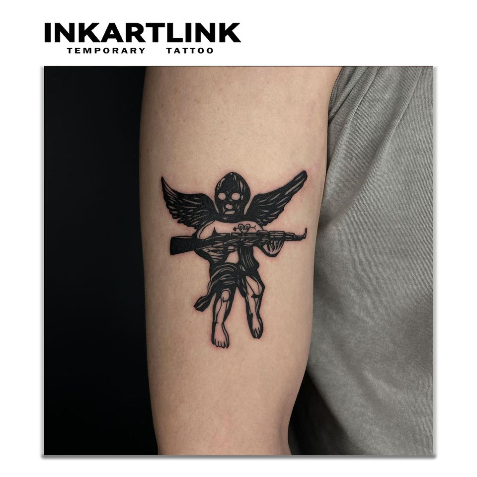 Shape:Dark Angel Gun Tattoo Sticker, Dynamic Posture Holding an AK47 Rifle