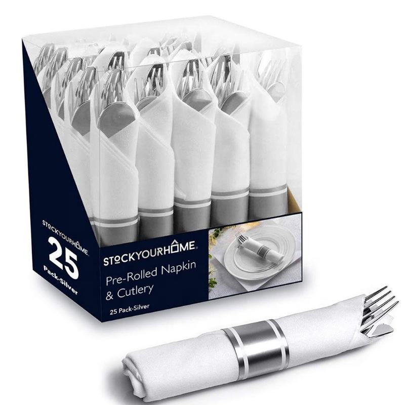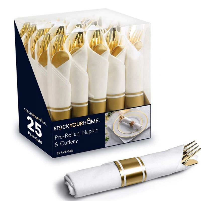 Commercio all'ingrosso arrotolato dorato avvolto posate posate Set forchette coltelli cucchiai tovaglioli usa e getta posate Set per la festa di nozze