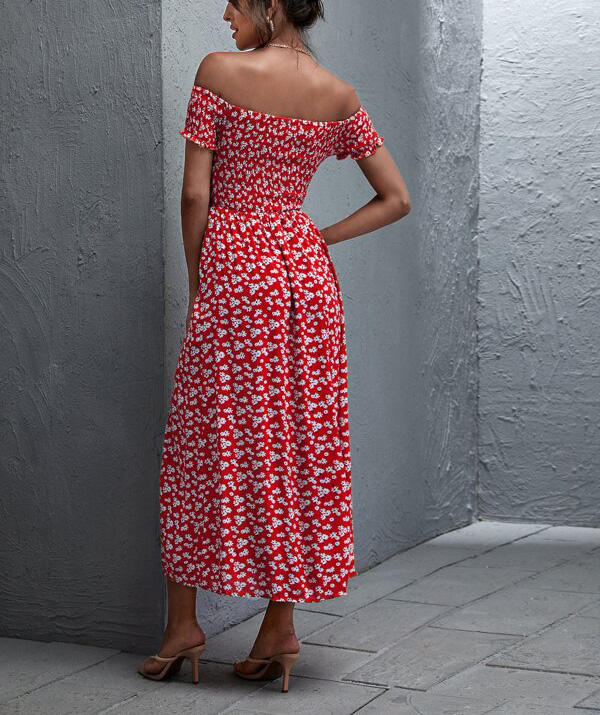 Commercio all'ingrosso di Primavera Estate Al Largo Della Spalla Stampa Floreale Arricciato Vestito Da Boho Manica Corta 100% Rayon Delle Donne Del Vestito Lungo