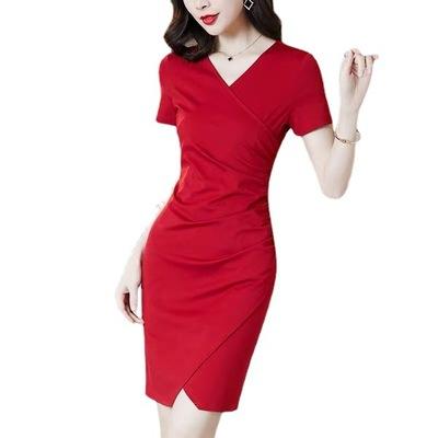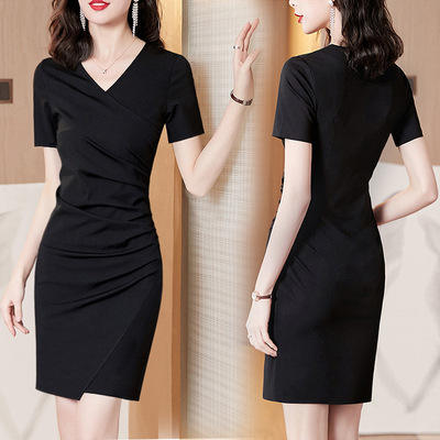 Wholesale Summer Elegant Black One-Step Pencil Dress with Slim Buttock Split Short Sleeve V-Neck Natural Waistline