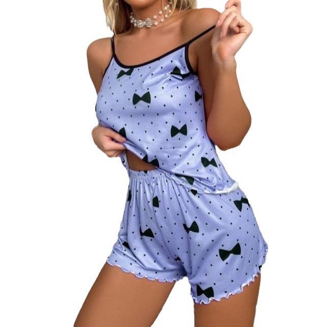Wholesale Summer Sleeveless Top Short Pants Bow Print 2Pcs Girls Sleepwears Milk Silk Casual Women's Pajamas Set