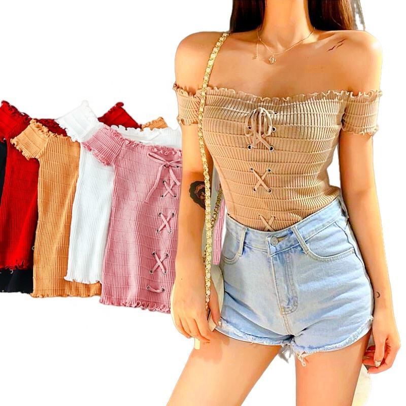 Camicetta lavorata a maglia a maniche corte elegante da donna con spalle scoperte estive all'ingrosso top monospalla da donna