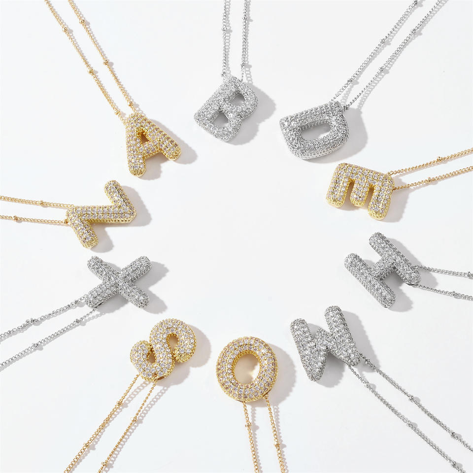 Wholesale Thick Gold Plated Brass Diamond Zircon Mini Balloon Bubble Letter Initial Pendant Necklace