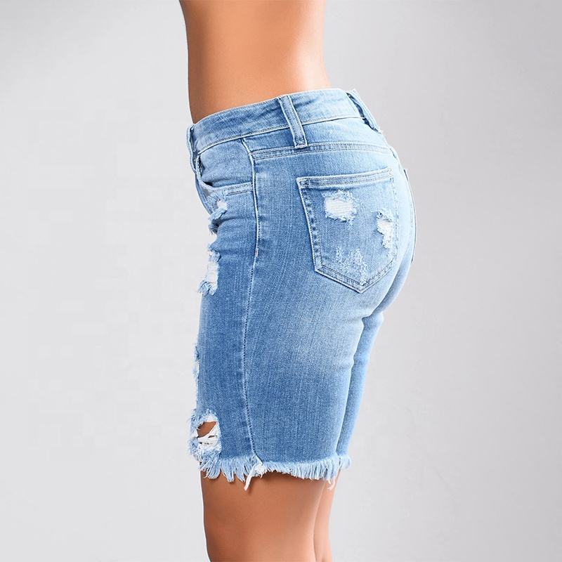 Wholesale Trendy Custom Private Label Bermuda Blue Jean Shorts Ripped Denim Jeans Shorts for Women