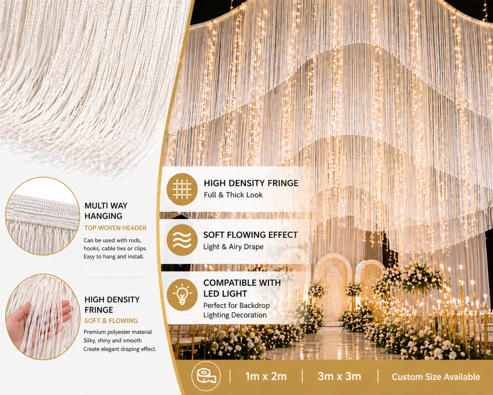 Tende a Frange Verticali in Poliestere Multicolore Oro Rosso Bianco per Matrimoni e Decorazioni da Soffitto