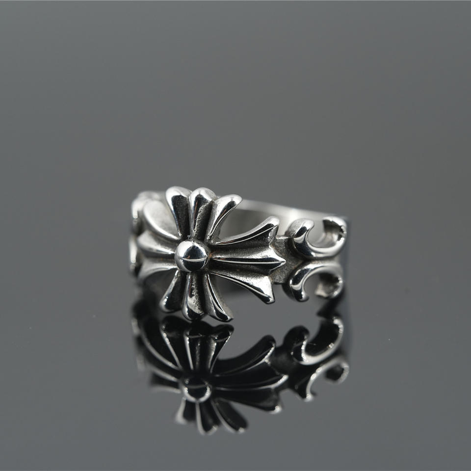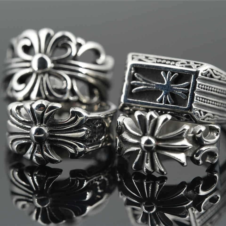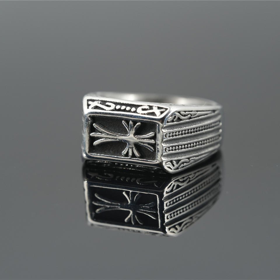 Wholesale Vintage Men Silver Minimalist Stainless Steel Cross Charm Chunky Ring With Stone