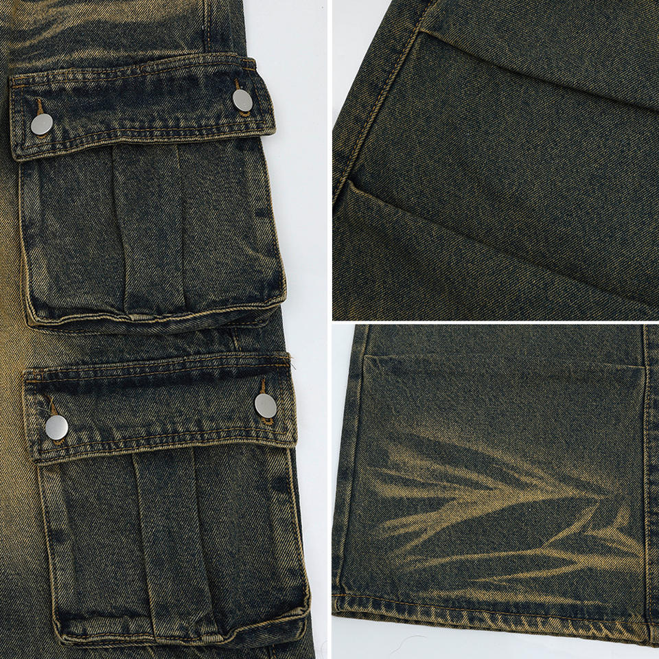 Ingrosso Washed Old-pocket in poliestere Denim pieghe moda Street Wear drappeggio larghi pantaloni dritti da uomo