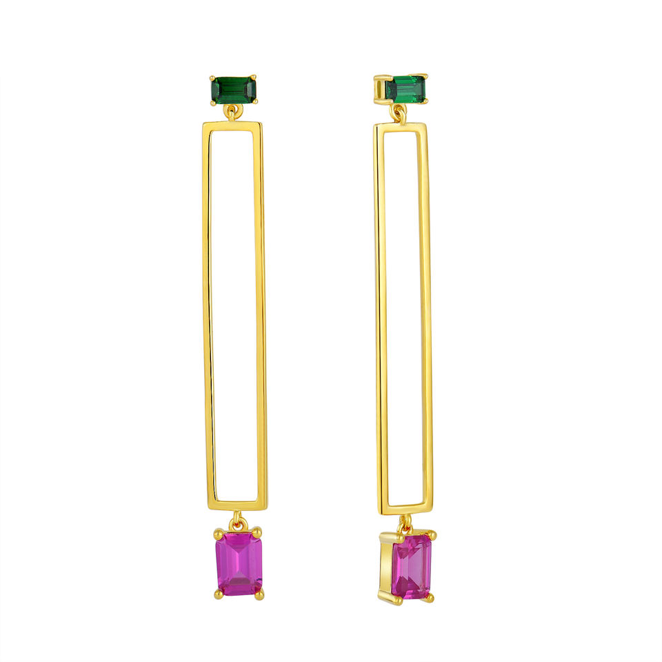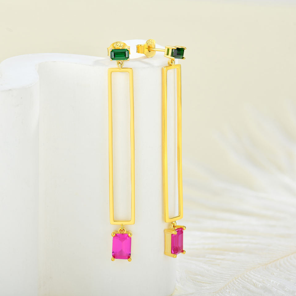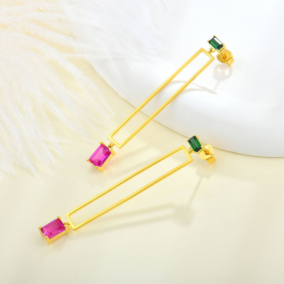 Orecchini Rettangolari Cavi in Argento 925 Placcato Oro con Due Zirconi Cubici, Impermeabili, Vendita all'Ingrosso