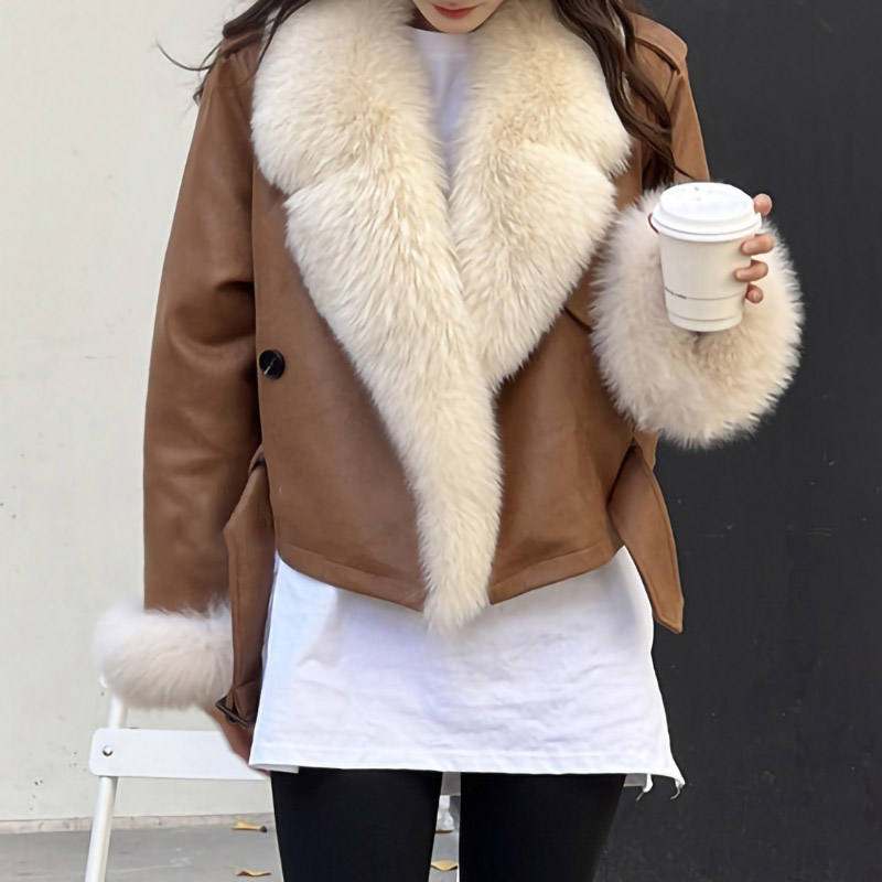 Wholesale Winter Goose Down Liner Suede Leather Fur Jacket Real Fox Fur Collar Cropped Leather Coat for Women