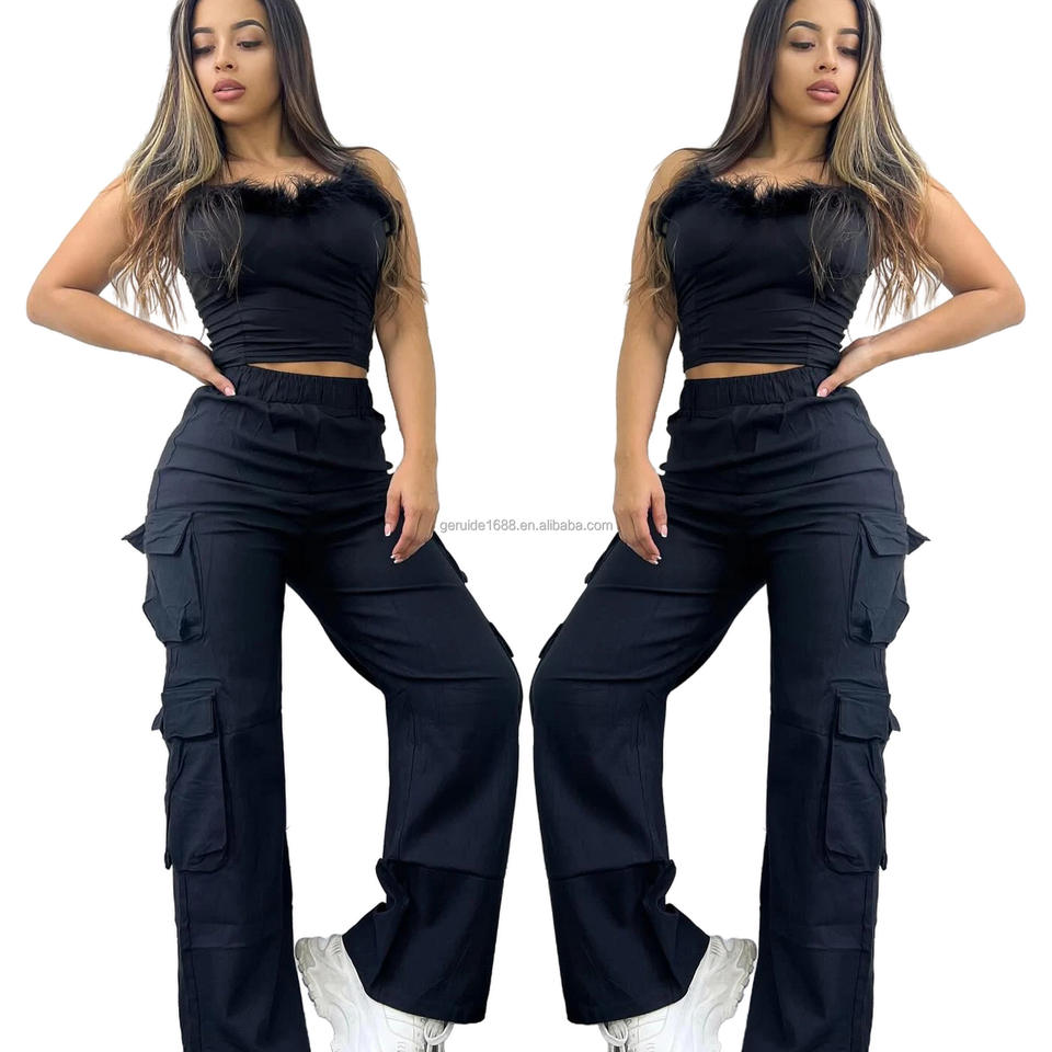 Wholesale Women Clothing Black Fashion Multi Pocket Casual Cargo Pants for Ladies