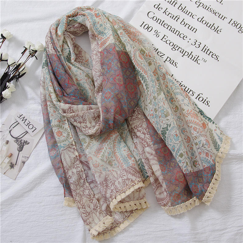 Wholesale Women Malaysia Viscose Hijabs Shoals Flower Silver Vintage Floral Print Lace Covered Pom Pom Tassels Cotton Scarf