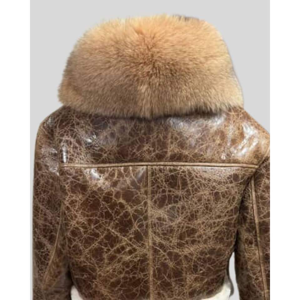 Giacca in pelle di pecora marrone da donna all'ingrosso con colletto e polsini in pelliccia di volpe reale - Cappotto invernale