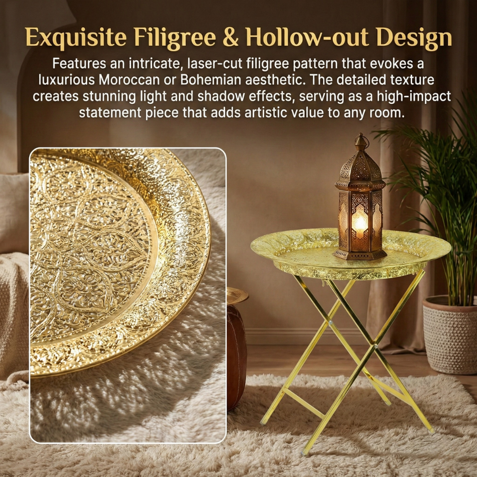 Tavolino da Caffè in Metallo Placcato Oro Stile Marocchino KD Design, Utile Tavolino Laterale per Decorazione Casa, Tavolino Pieghevole in Metallo Dorato