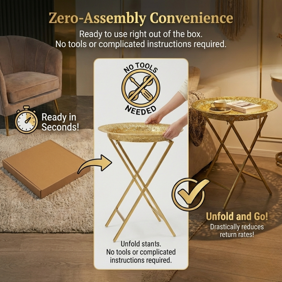 Rivestimento dorato a galvanica: Trattato con un processo di galvanizzazione di alta qualità, il tavolo ha un rivestimento uniforme e lucido, resistente agli scalfi e all'ossidazione, mantenendo il suo aspetto premium in vari ambienti.