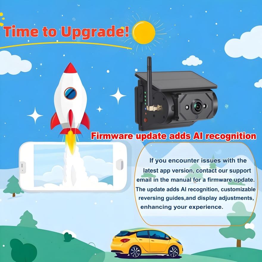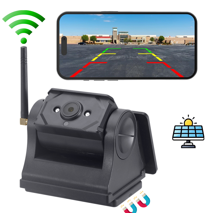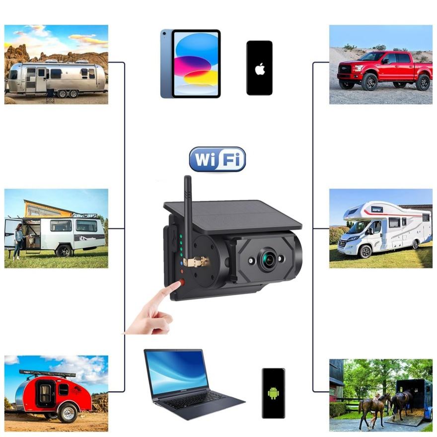Telecamera Wireless per Auto con Pannello Solare Wi-Fi, Visione Anteriore e Posteriore 100m, per Bus, Furgoni, Camion, Camper, Compatibile con iOS e Android