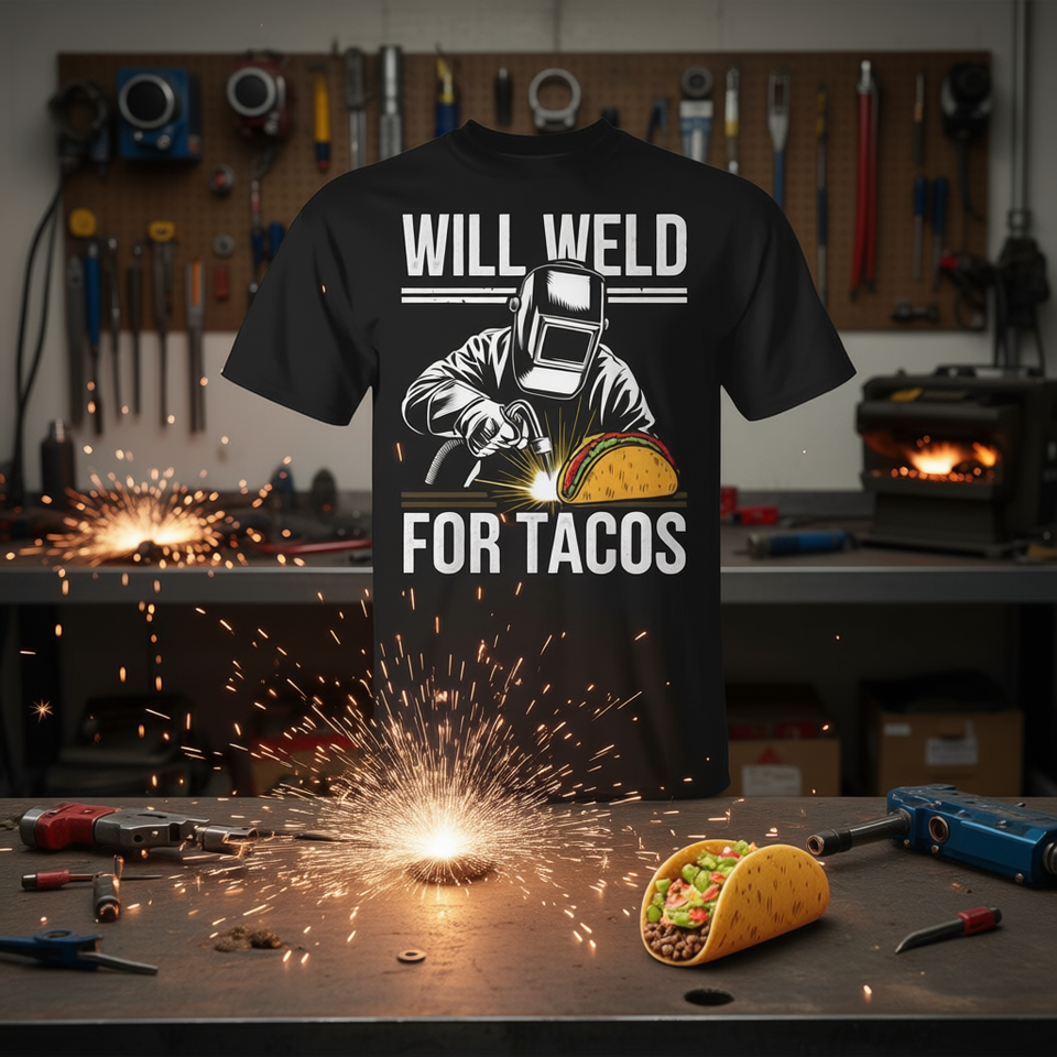 Maglietta Will Weld For Tacos con grafica divertente, camicia casual da uomo