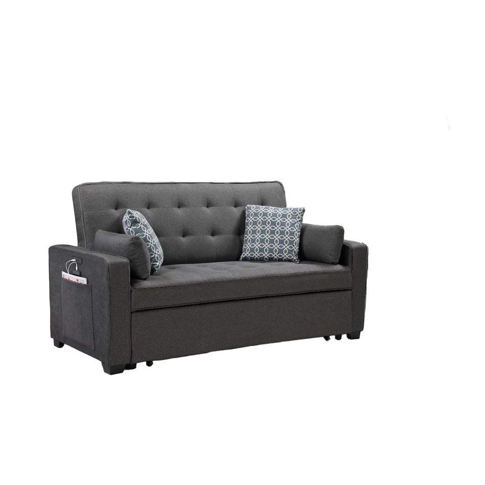 Divano letto moderno William da 70 pollici in tessuto grigio con 2 porte USB per la ricarica e 4 cuscini decorativi