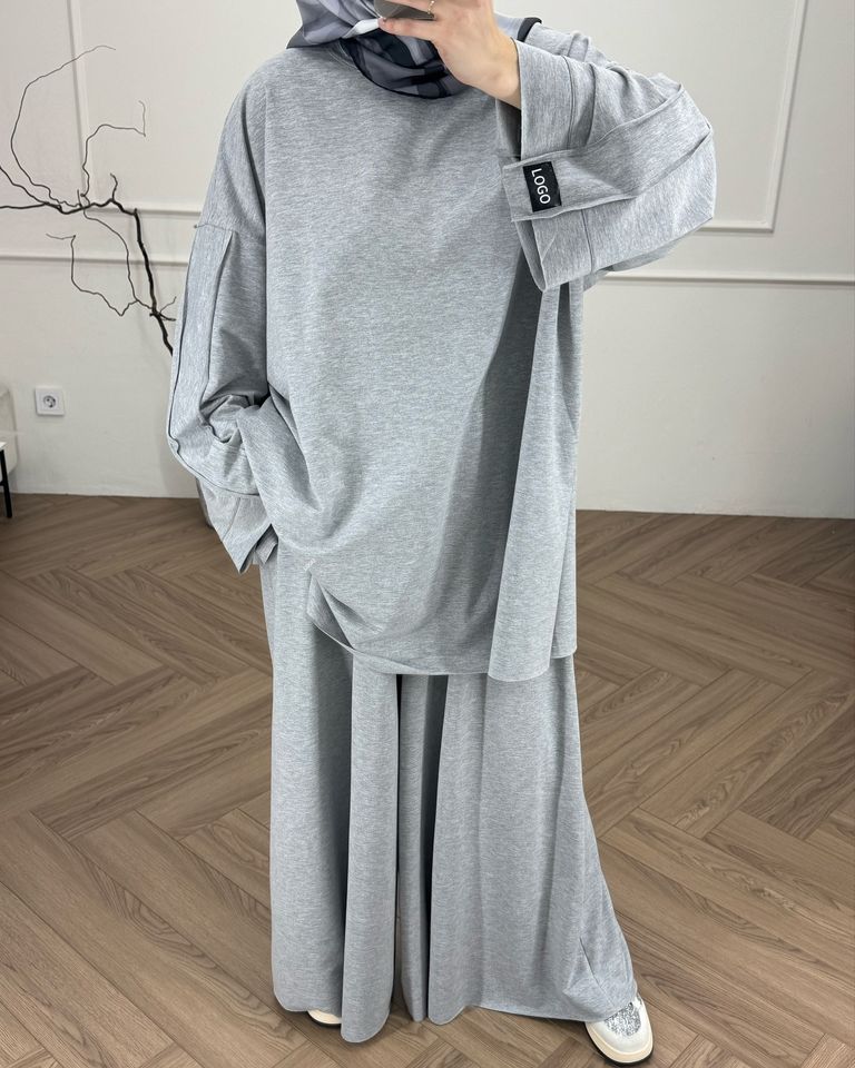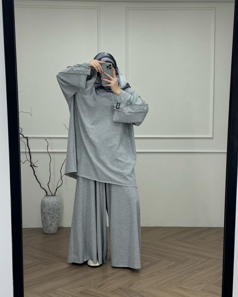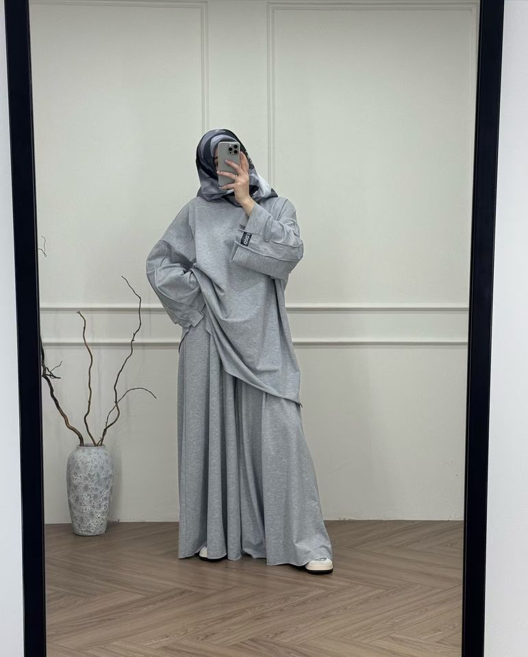Set da Donna Musulmano Wilson in Jersey di Cotone Abito Modesto Taglie Forti Grigio Abaya Maxi Dress con Top Abbinato