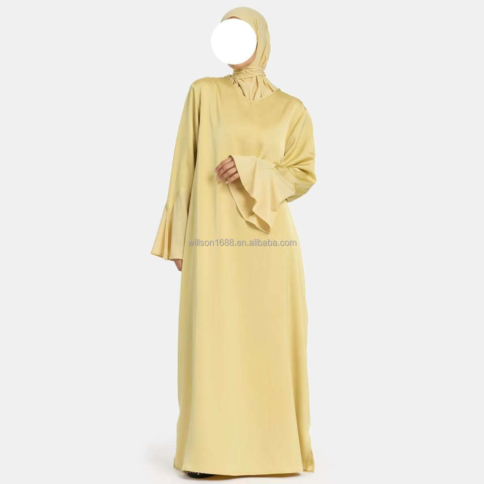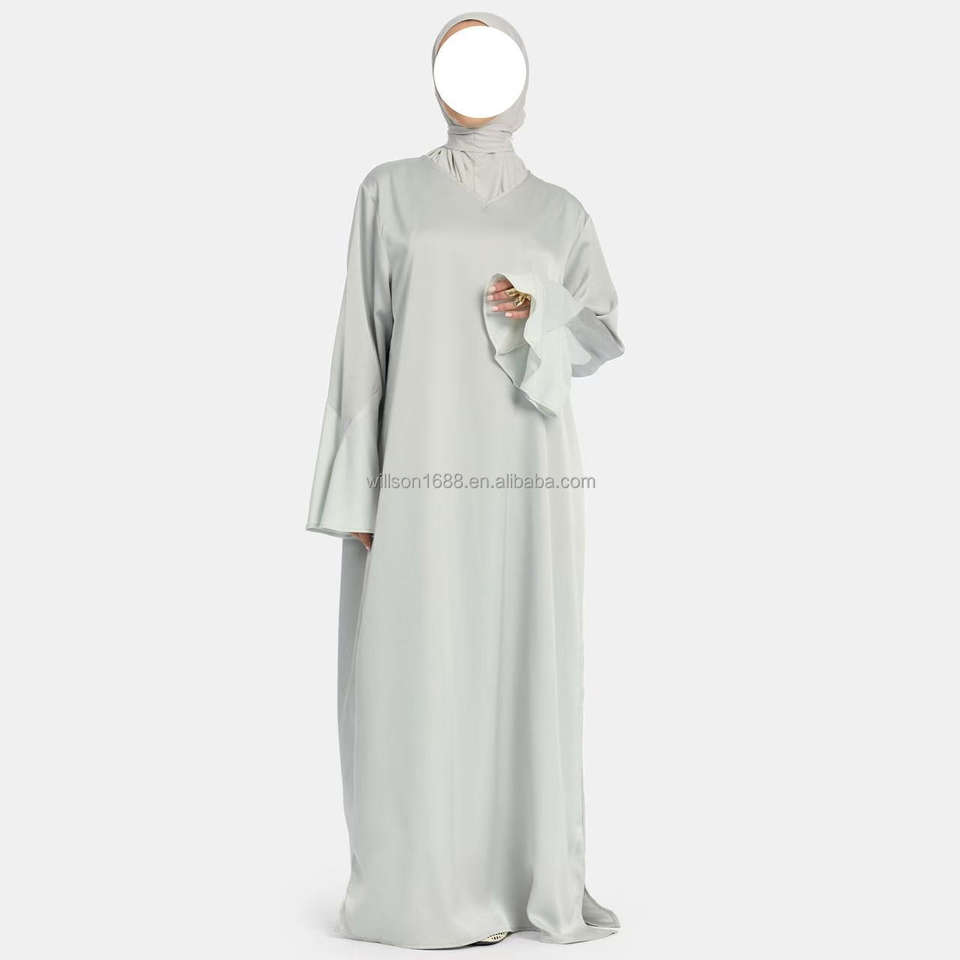 Willson Satin Jersey Sleeve Dress V - Neck Elegant Comfortable Simple Gentle Smooth Style with Side Slits Abaya for Women