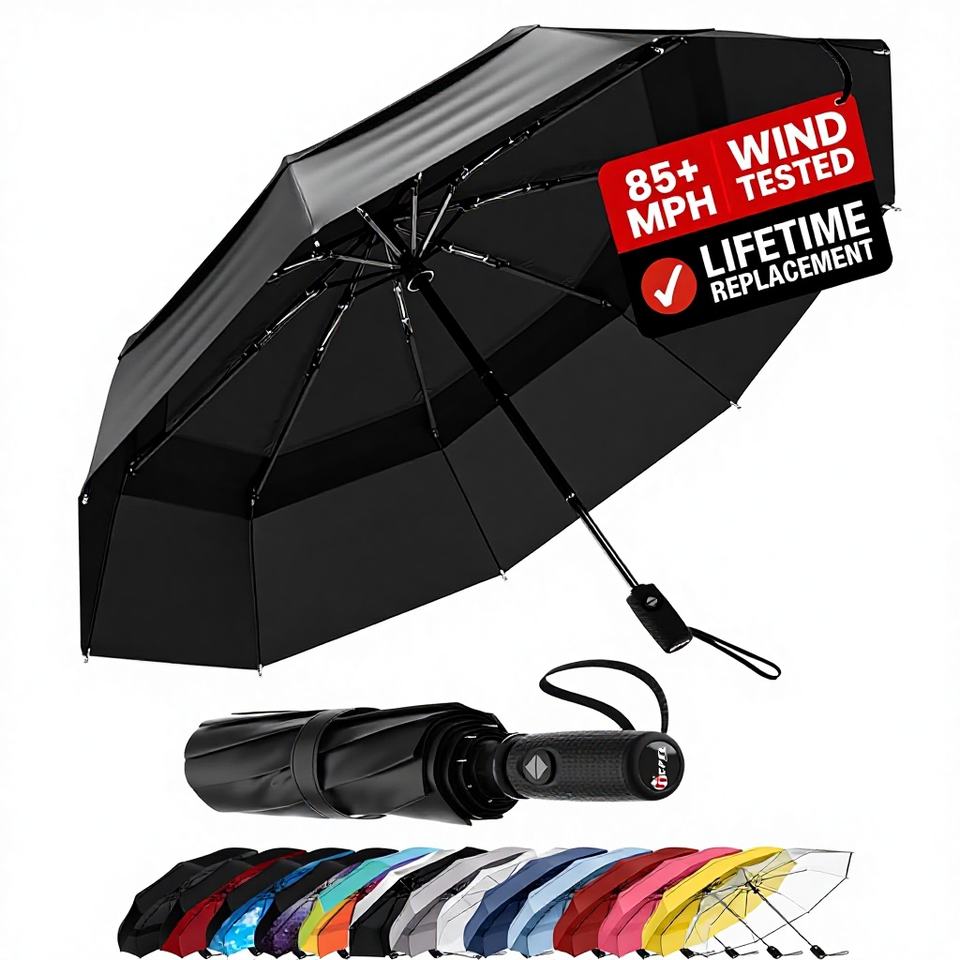 Ombrello da Viaggio Classico Antivento Pieghevole Automatico, Resistente a 85MPH, in Lega Premium, Leggero e Portatile, Unisex, per Pioggia/Sole