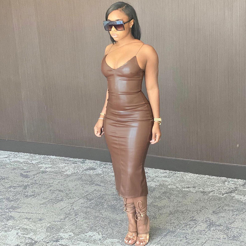 Wine Black Beige Brown Pu Leather Dress Women Sexy Spaghetti Straps V-Neck Backless Midi Bodyocn Party Club Long Dress 2026 New
