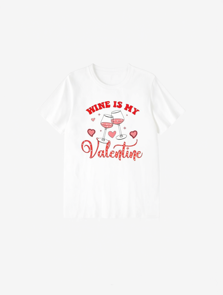Wine Is My Valentine Women's Printed T-Shirt Casual Short Sleeve Crew Neck Jersey Fabric Spring Summer Regular Fit