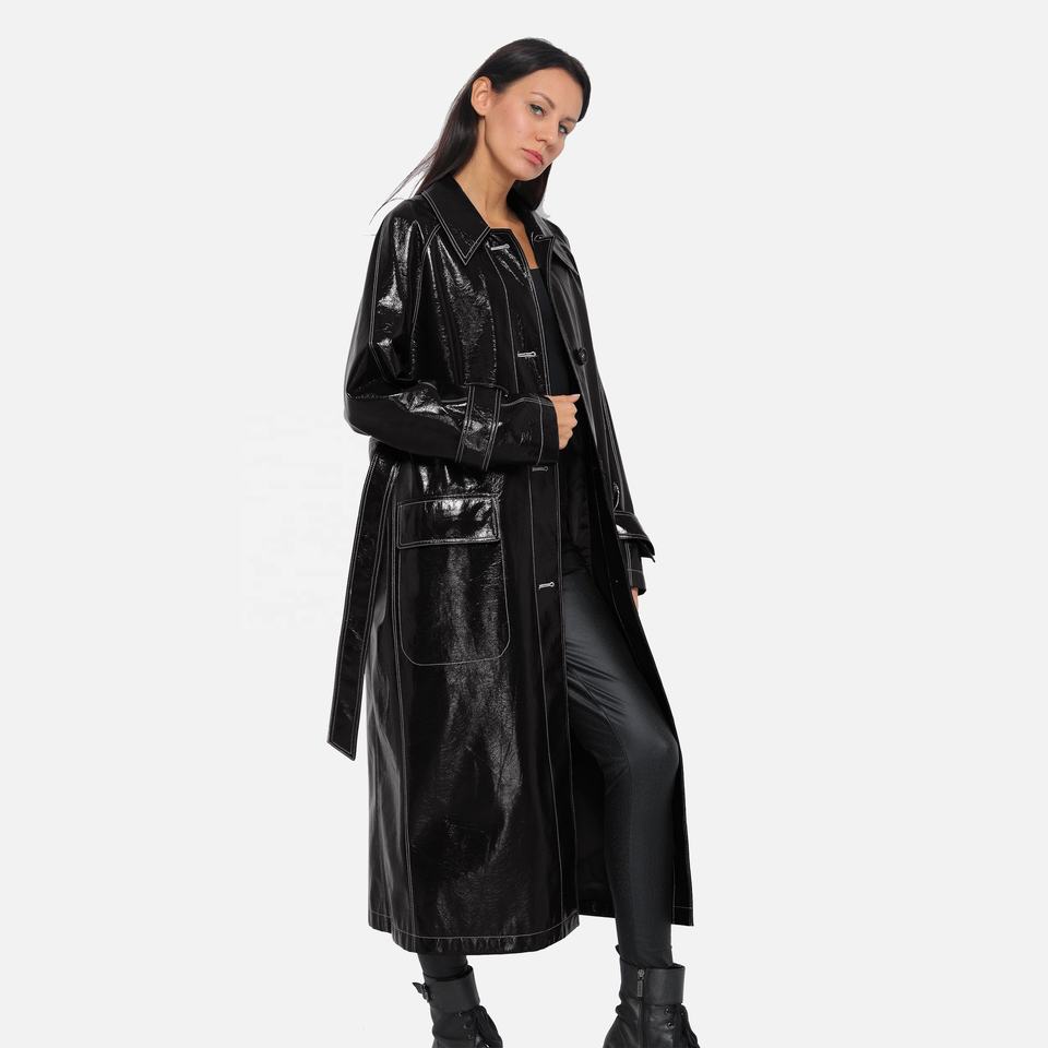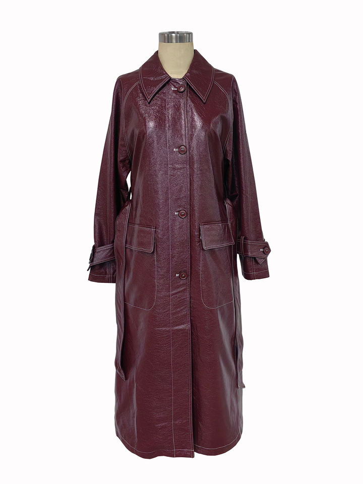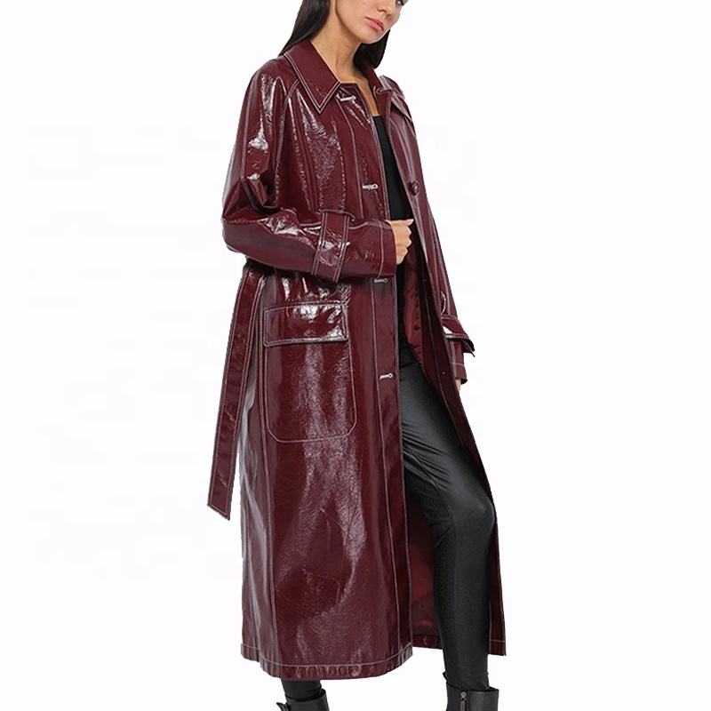 Wine Red Trench Women's Slim Motorcycle Pu Leather Coat Long Slim with Belt Women's Leather Trench Coats