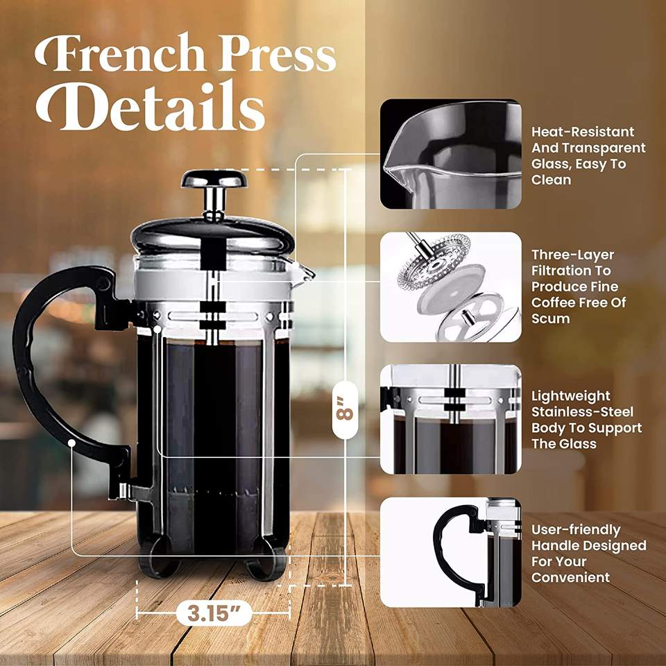 Struttura in acciaio inossidabile: La struttura in acciaio inossidabile conferisce durata e stabilità alla caffettiera a stantuffo, assicurando un prodotto durevole e affidabile per un uso quotidiano.