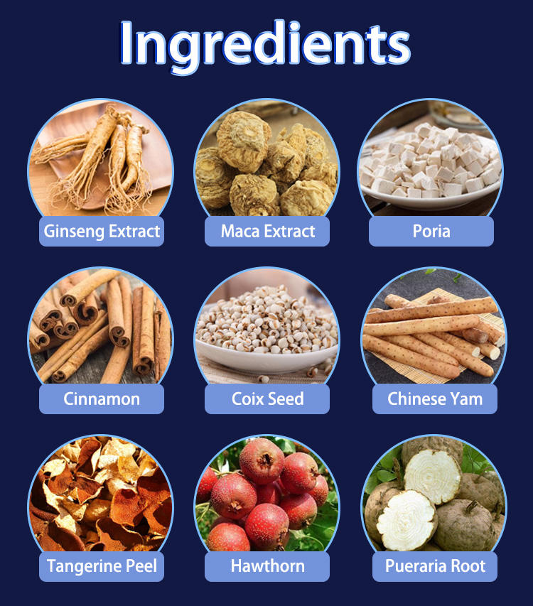 Ingrediente principale:Estratto di Ginseng, estratto di Maca, Poria, cannella, semi di Coix, igname cinese, buccia di mandarino, biancospino, radice di Pueraria, dente di leone, erba medica, isoflavoni di soia