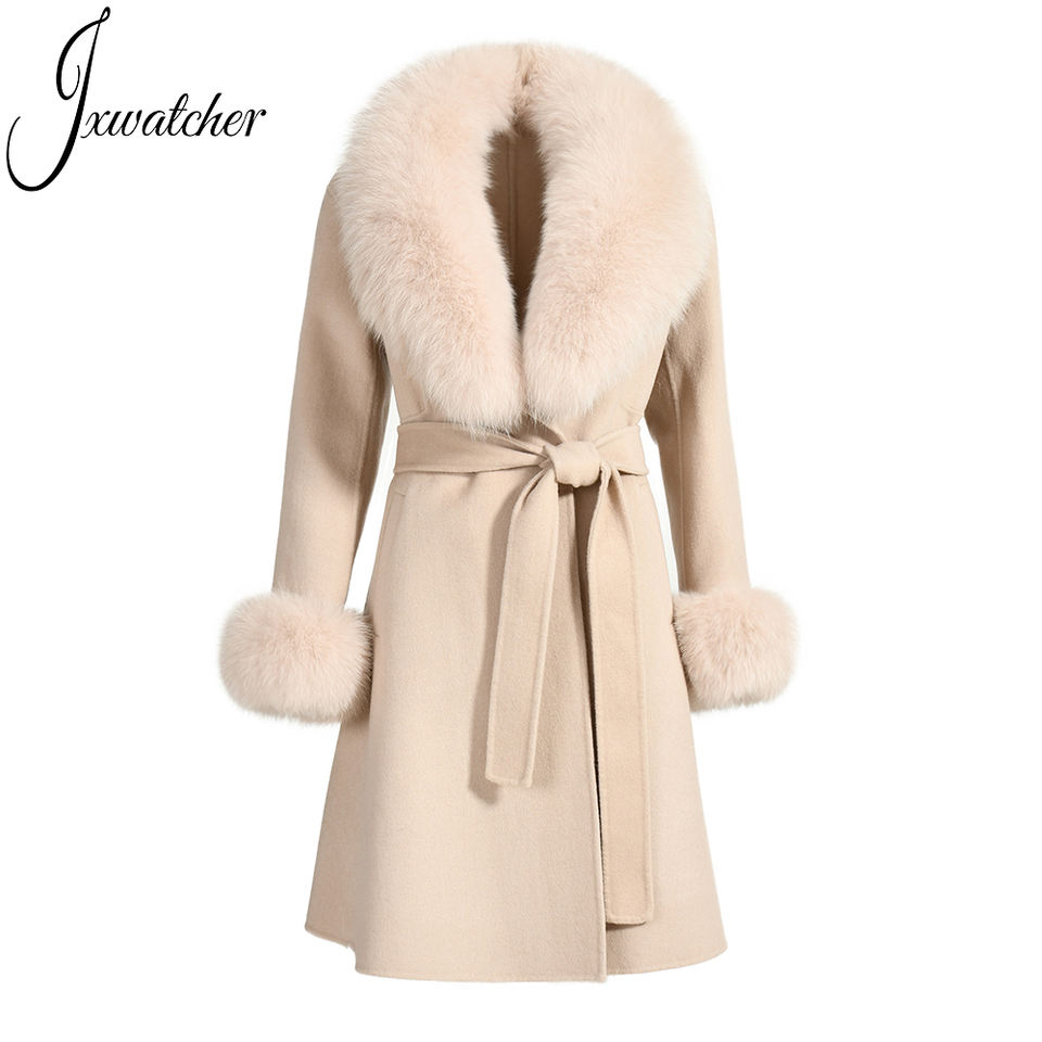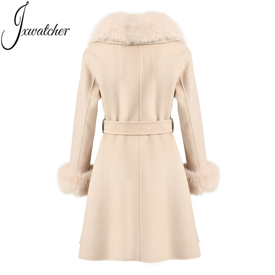 Cappotto lungo in cashmere e lana double-face per inverno con colletto e polsini in pelliccia di volpe rimovibili, alta qualità