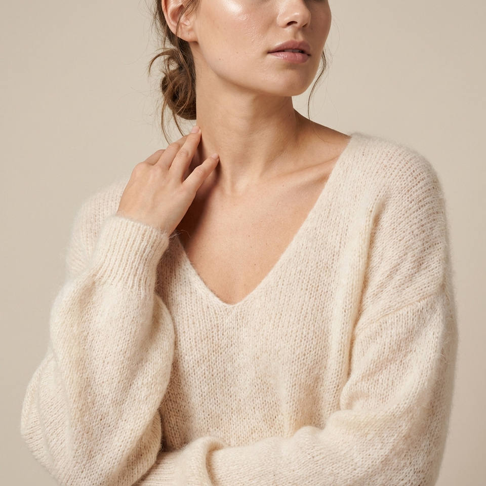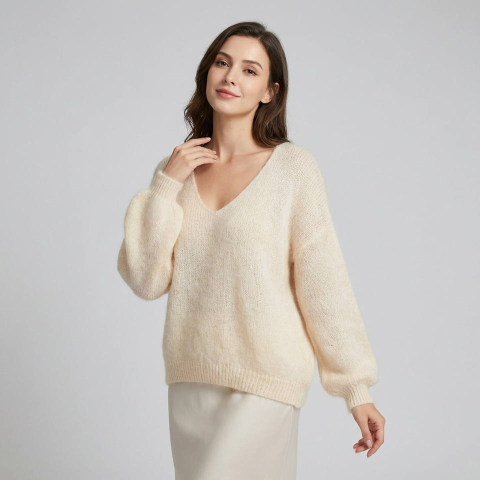 Winter Casual Breathable Solid V-Neck Long Sleeve Puff Sleeve Ribbed Sweater 80% Kid Mohair Polyamid/Spandex