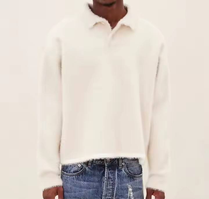 Maglione Invernale da Uomo in Mohair Spazzolato Jacquard Personalizzato, Pullover POLO a Maniche Lunghe, Taglia Grande, in Finta Pelliccia Bianca