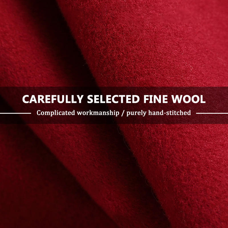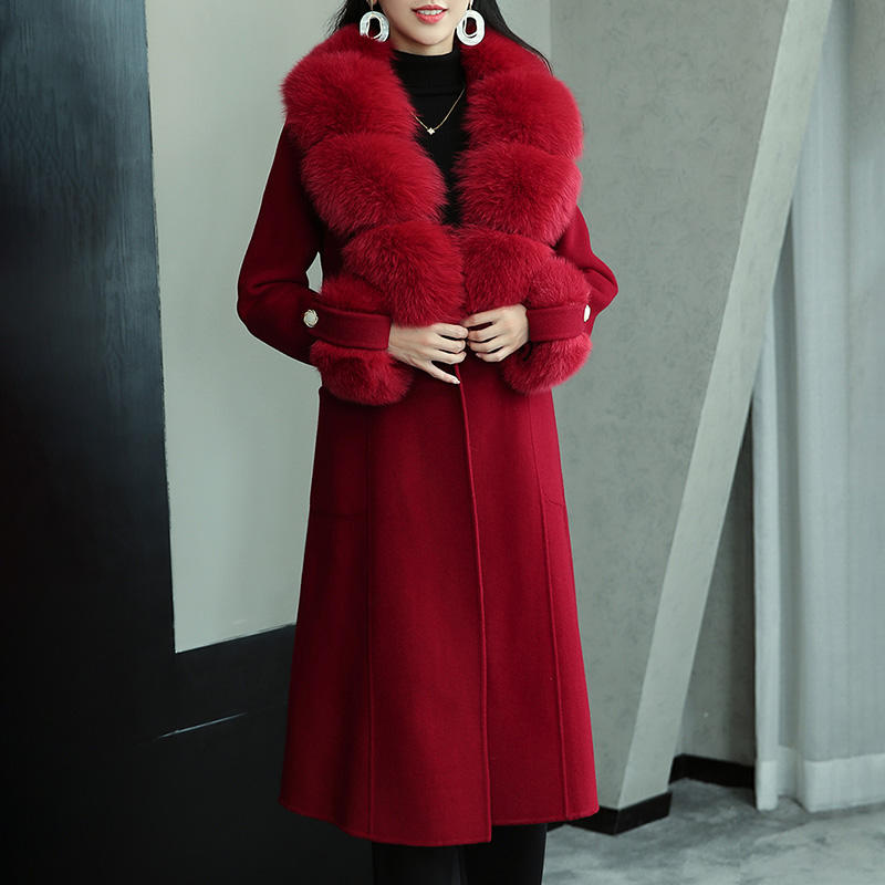 Cappotto Lungo Invernale da Donna in Misto Lana e Cashmere Rosso a Tinta Unita con Collo in Pelliccia di Volpe