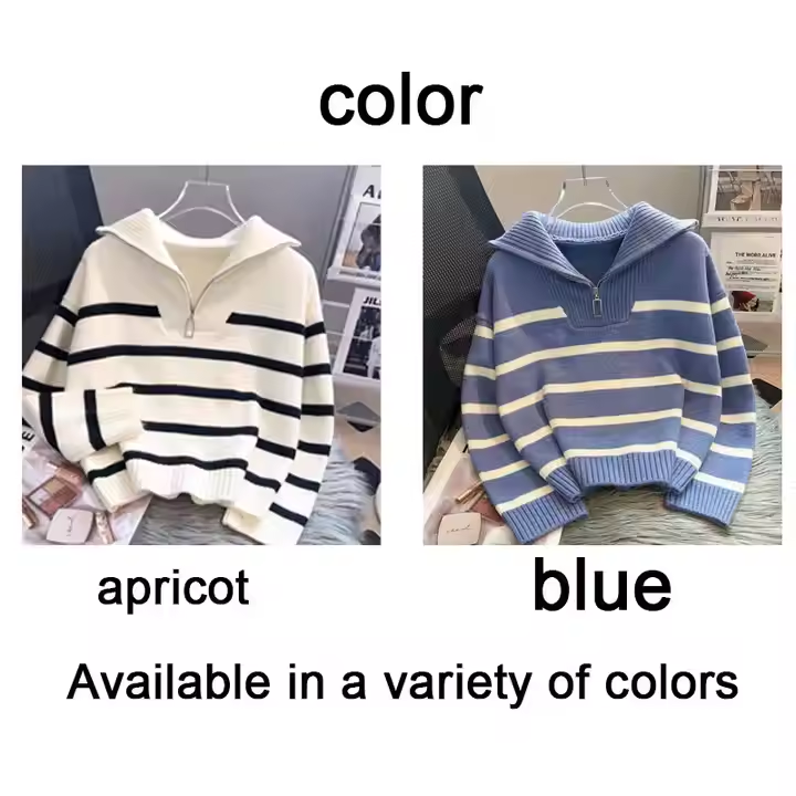 Winter Women's Leisure Turtleneck Long Sleeve Striped Pullover Half Zip Knitted Loose Sweater