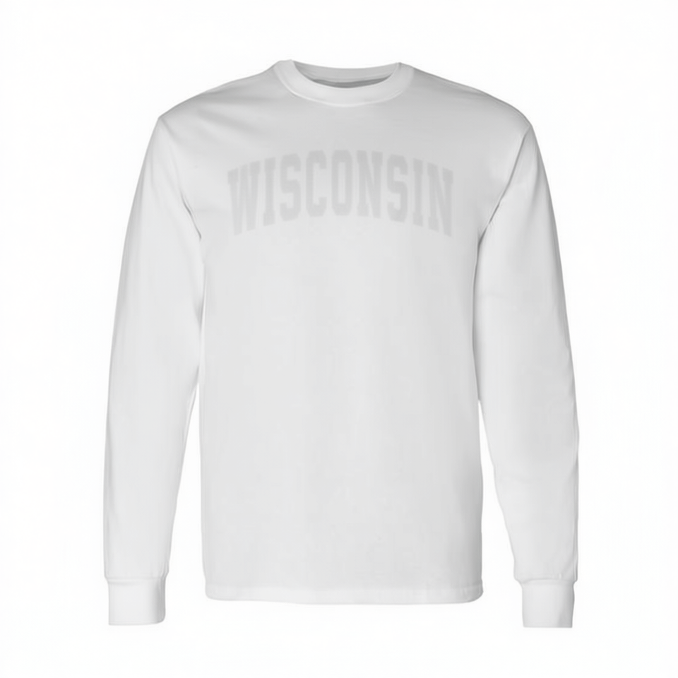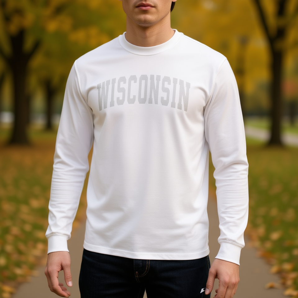 T-Shirt a Maniche Lunghe con Stampa Serigrafica Wisconsin, Cotone Bianco, Collo Tondo, Unisex, Stile Sportivo per Adulti